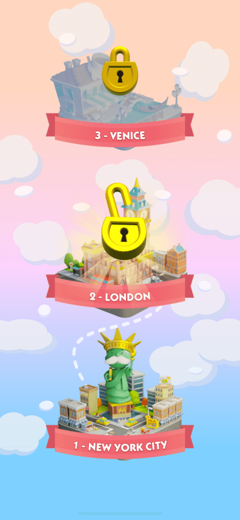 Once you’ve gotten used to most of the core mechanics, you’ll complete all the buildings in New York. Upon completing all buildings in New York, you progress to London, which introduces us to the core loop of the game and a new board. Completing a board can give players an assortment of cash, rolls, and/or tickets.