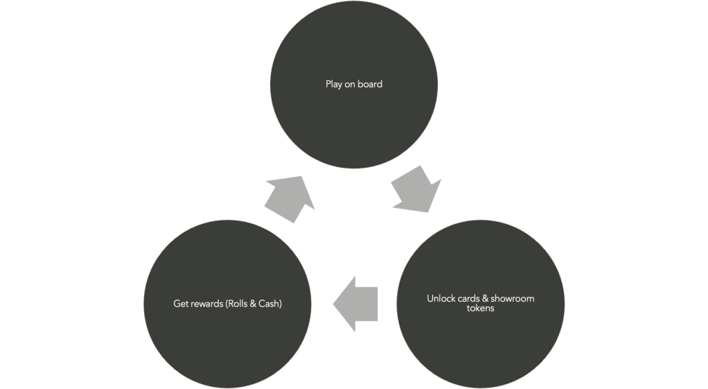On the board: On the board, you hit various tiles to earn a small amount of cash via rolls. After passing your max threshold of rolls (eg, 49/50, 30/50), your rolls will start to replenish at roughly 5 or 6 rolls per hour. Upon making a full round-trip around the board, you are rewarded with more cash.