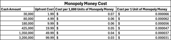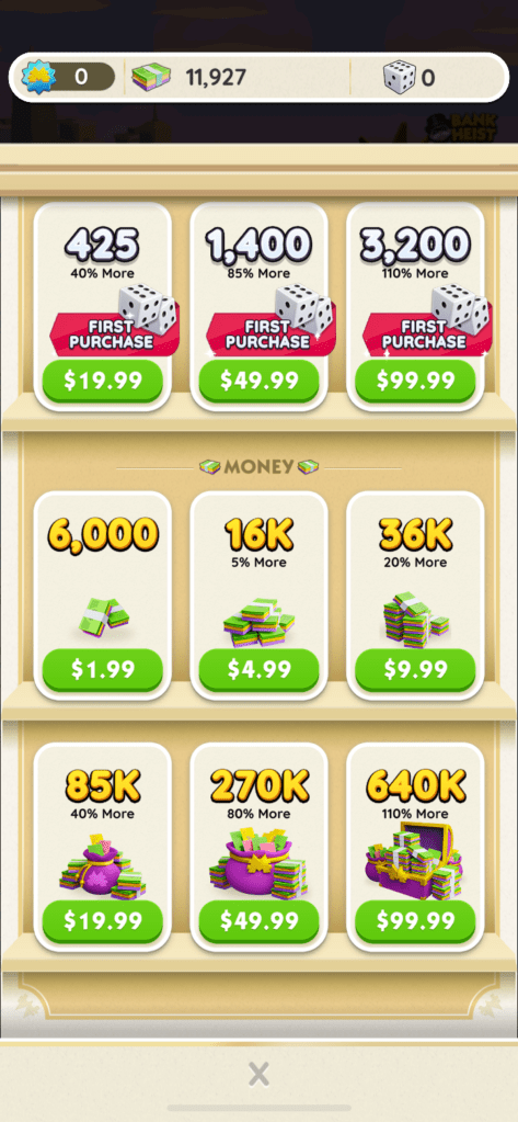 Monopoly Go has a stationary shop that only consists of rolls, and cash. As would be expected, your value per roll or value per unit of monopoly cash increases as you pay more. A nominal increase in value, but the increase in playtime or upgradeable buildings is quite vast.