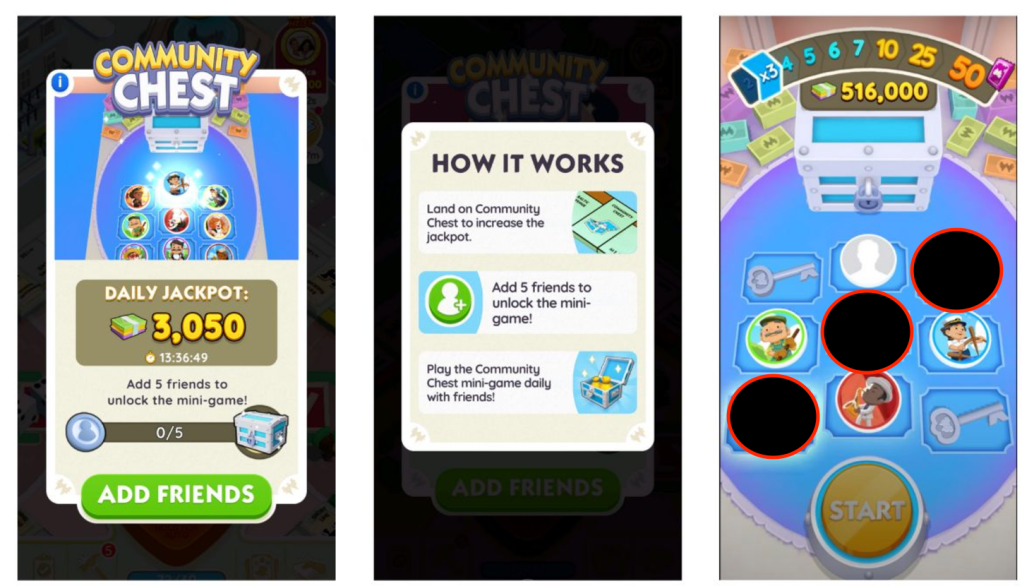 The objective for the Community Chest minigame is pretty simple. You tap the “Start” button to remove friends from the board and land on the Community Chest key. Once you open the chest, you will see a board with nine of your friends.