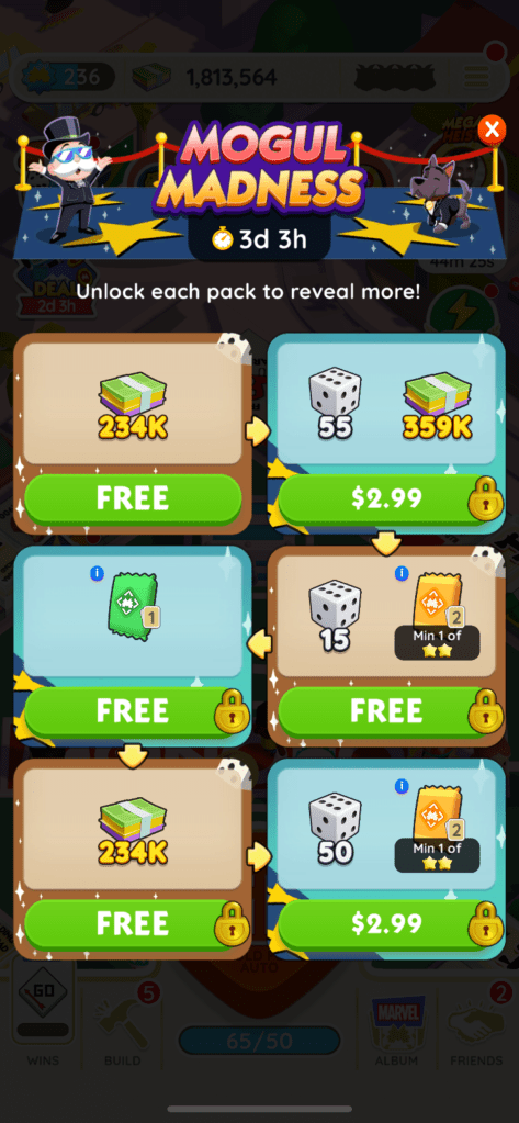 What’s more, it is loosely tied to the core loop of the game. Ultimately, the only thing I need to invest is a little more time. This is great because players are rewarded with bigger payoffs for the time they spend. Monopoly Go and Scopely are able to benefit because they get higher levels of retention and can monetize a bit off their LTM’s.